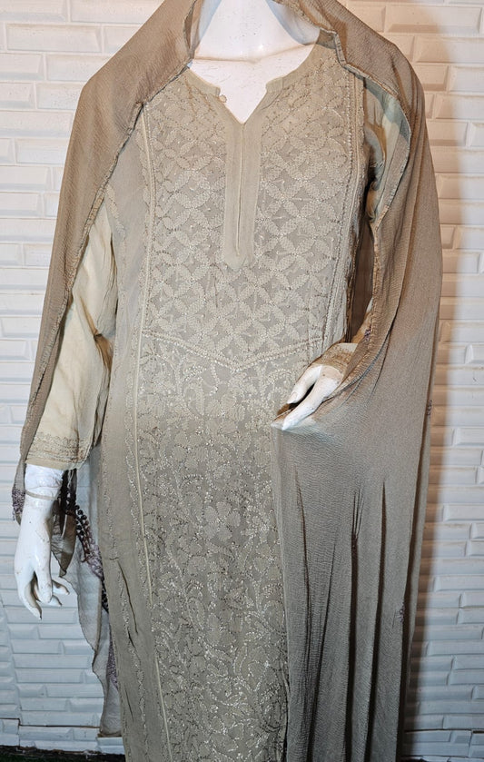 Army Beige Enchanting Lucknawi Jaal - Chikankari Festive Set - Kurti, Sharara & Dupatta -(Inner Included)