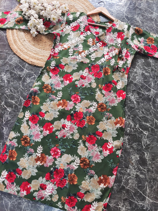 Army Green Mulmul Angarkha Style Floral Dori Long Chikankari Kurtis ✨
