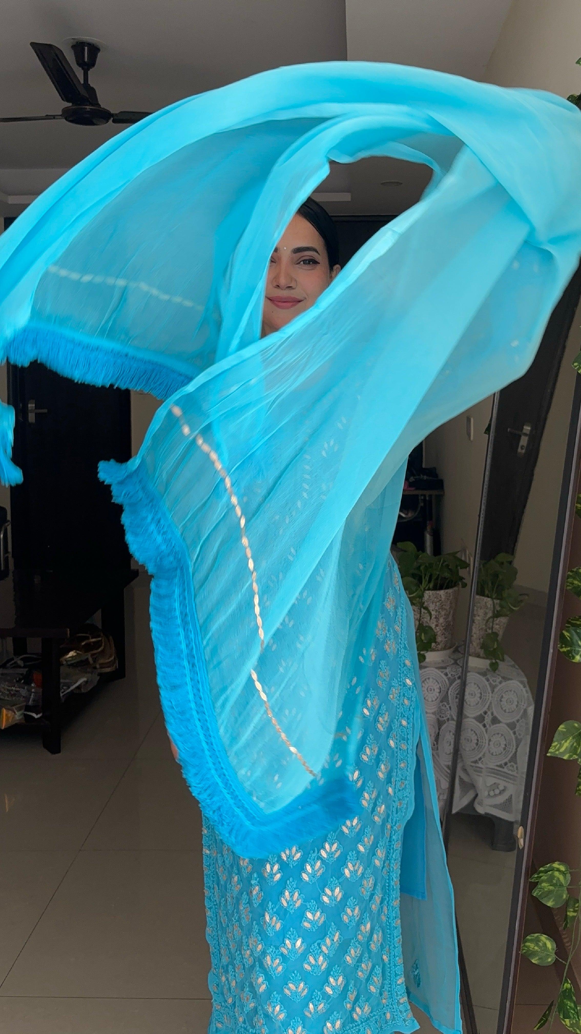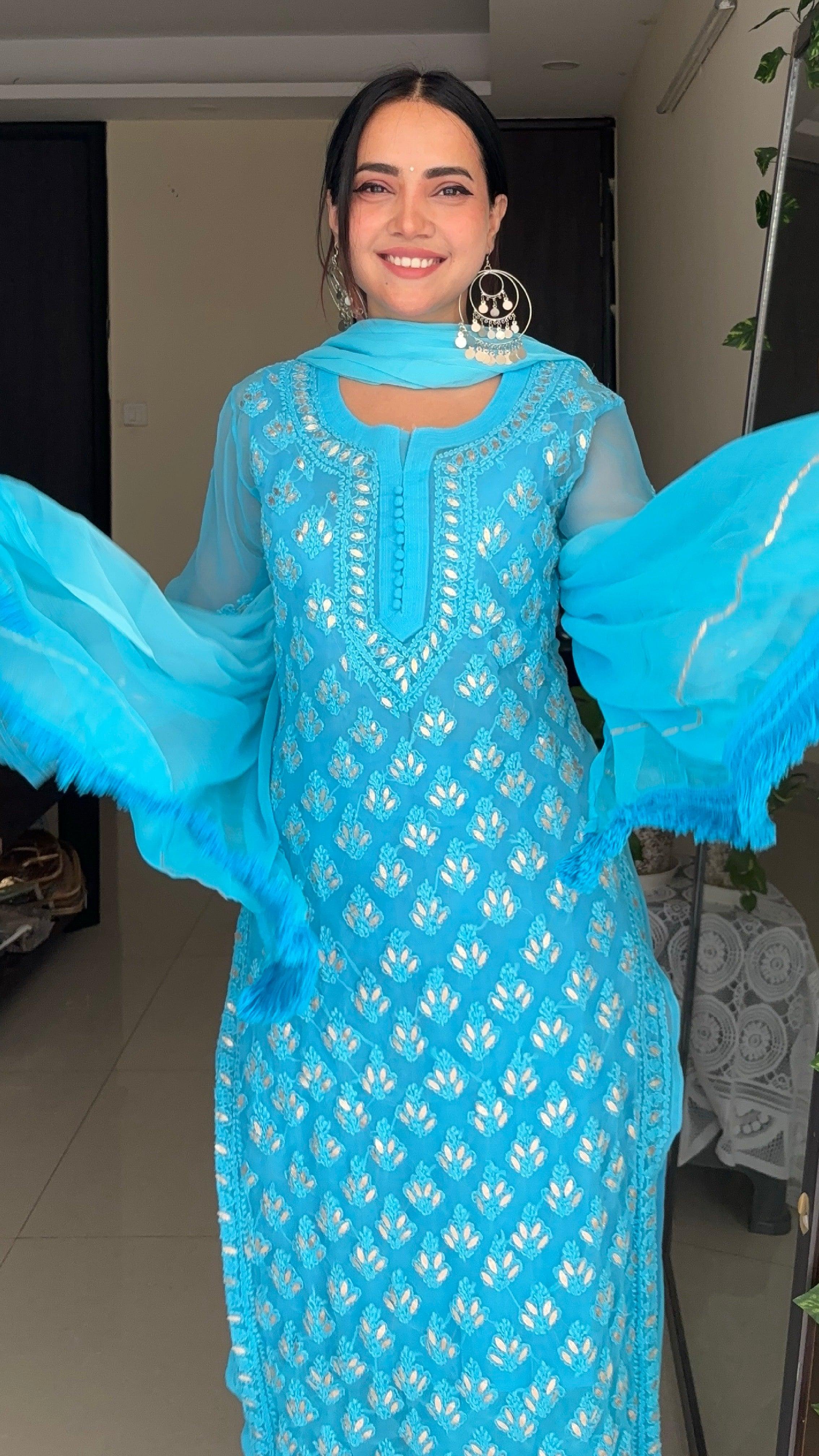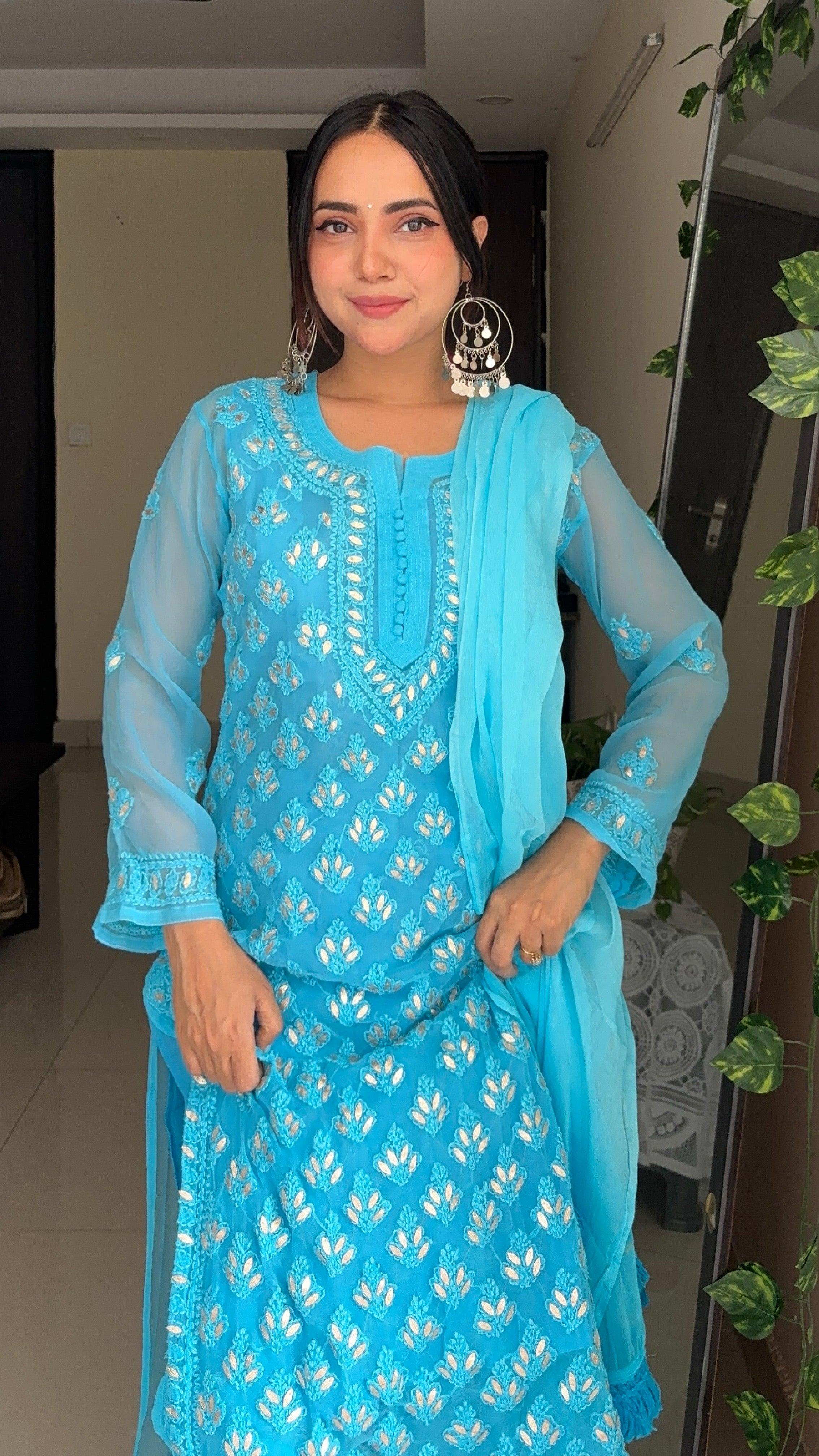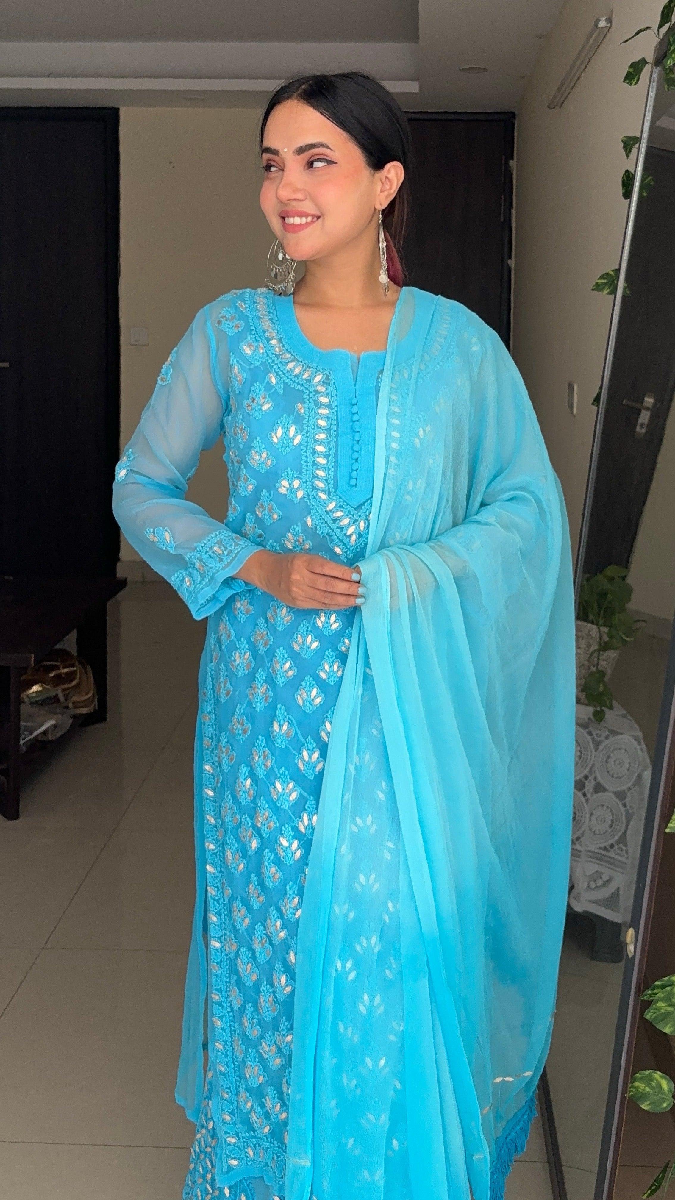 Aqua Blue Georgette Gotta Patti Kurti Sharara Salwar Suit (Inner Included)