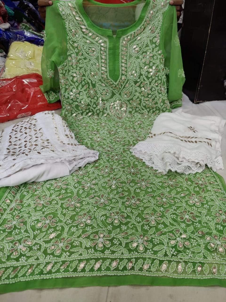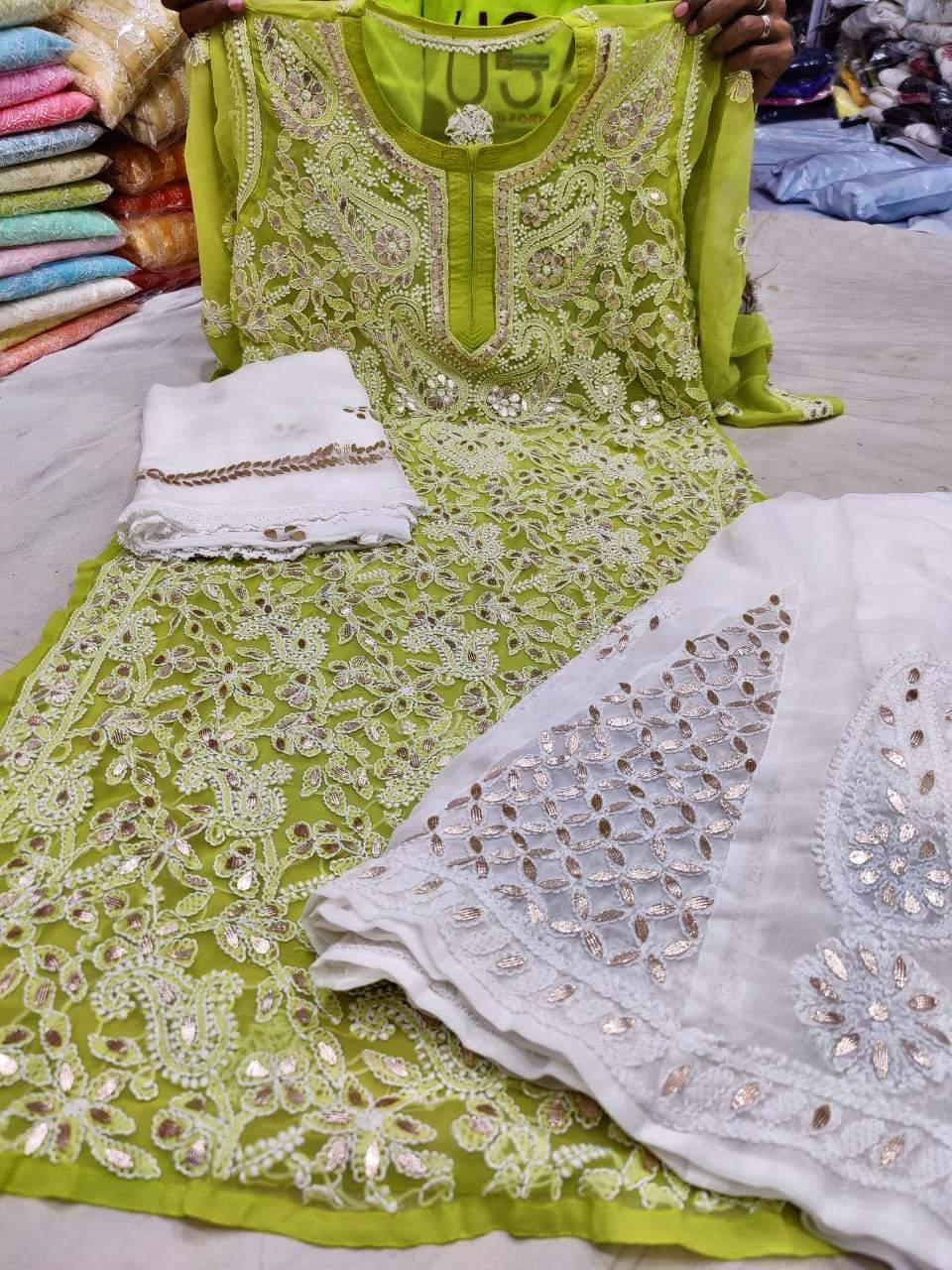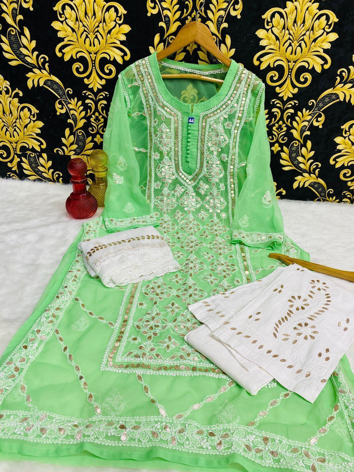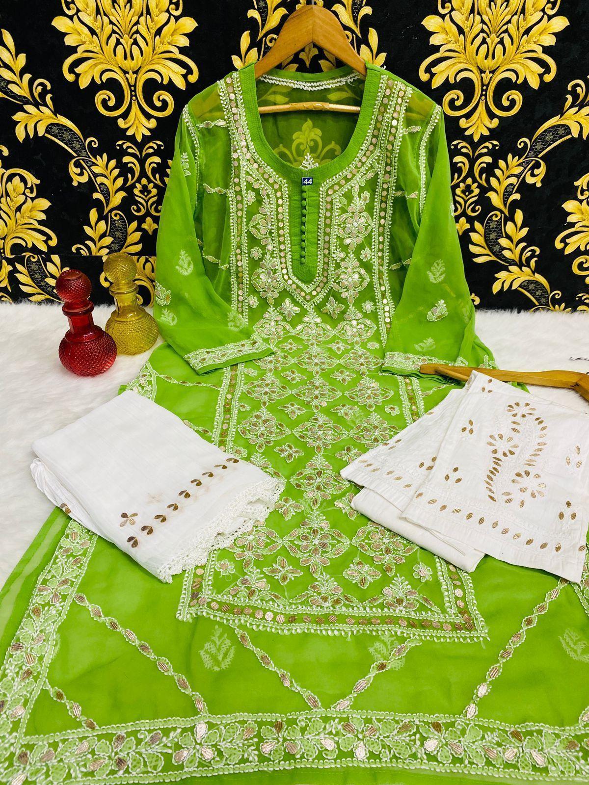 Parrot Green Graceful Lucknawi Georgette Chikankari GotaPatti Ensemble (Inner Included)