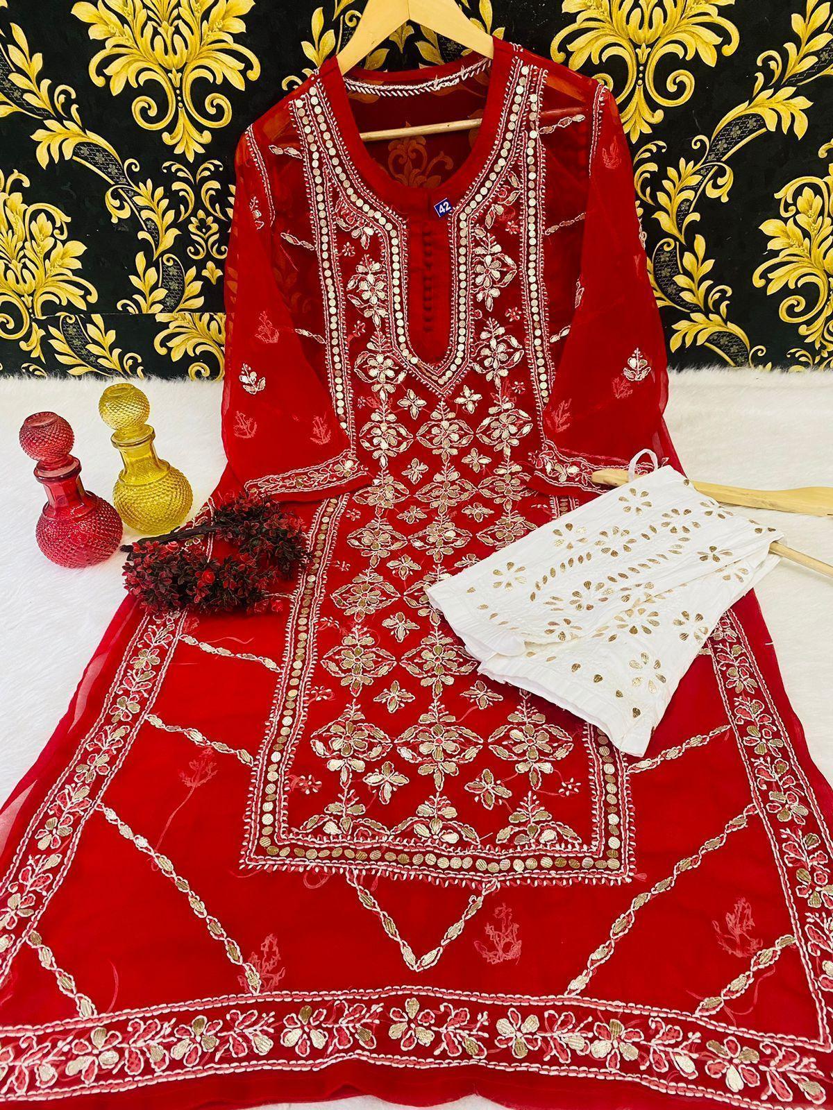 Red Graceful Lucknawi Georgette Chikankari GotaPatti Ensemble (Inner Included)