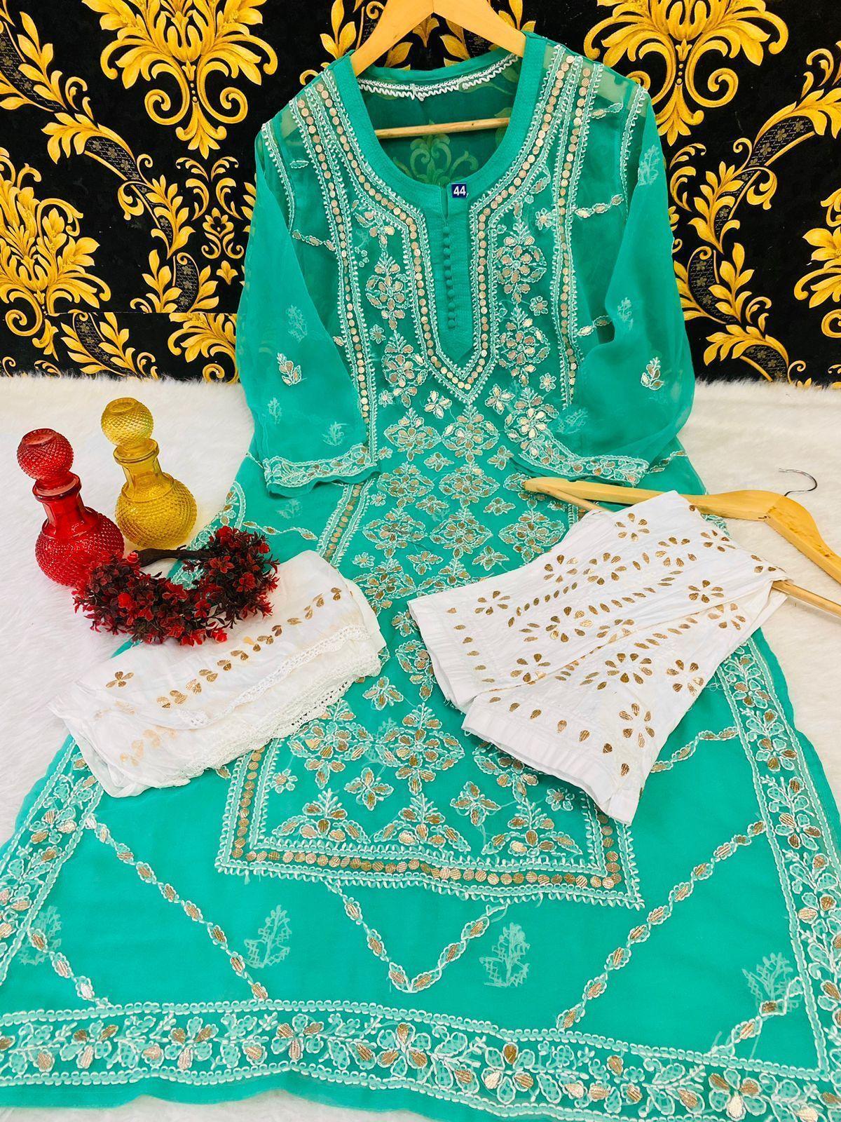 Teal Green Graceful Lucknawi Georgette Chikankari GotaPatti Ensemble (Inner Included)