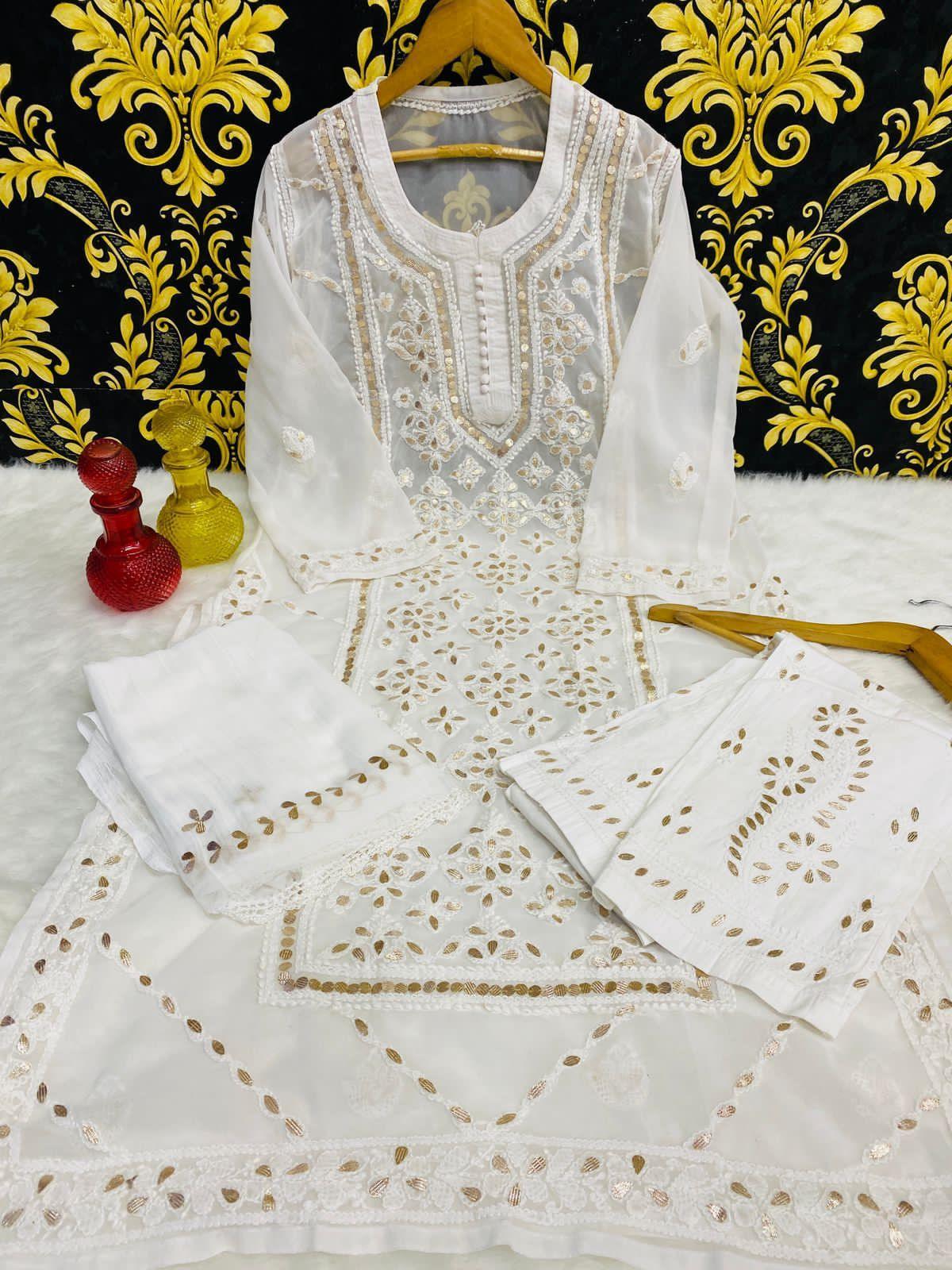 White Graceful Lucknawi Georgette Chikankari GotaPatti Ensemble (Inner Included)