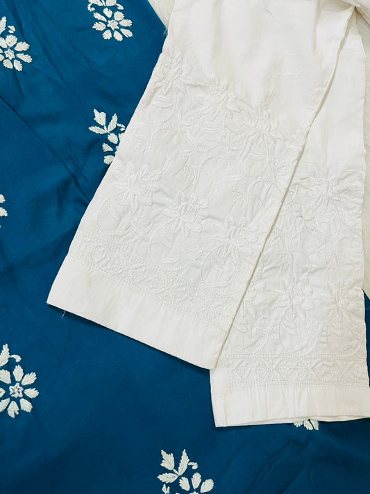 Teal Blue Handcrafted Resham Kurashiya Kurti & Lycra Chikankari Pants Set