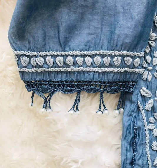 Blue Handcrafted Resham Kurashiya Kurti & Lycra Chikankari Pants Set