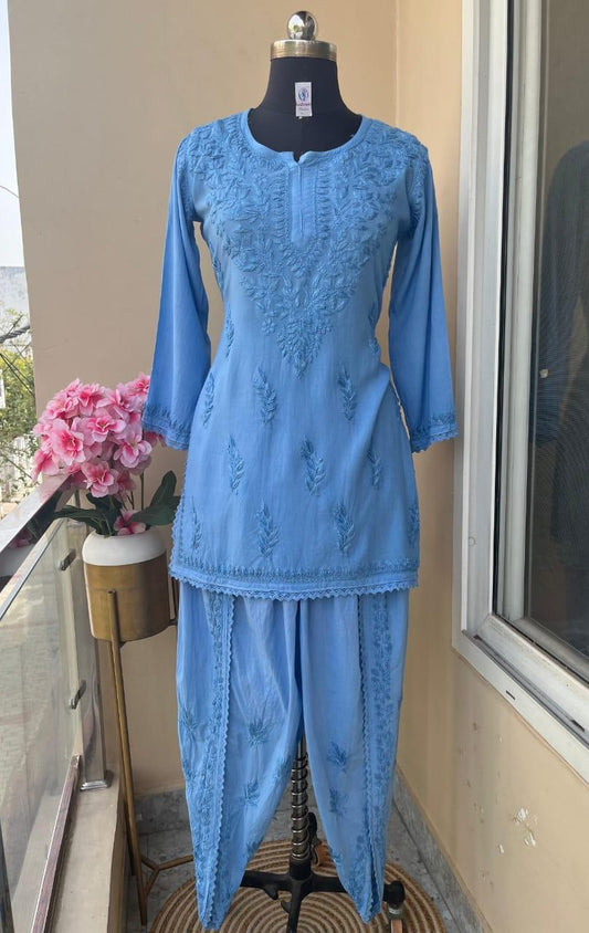 Blue Cotton Rayon Short Kurti + Cotton Dhoti Pant Lucknow Chikankari Co-ord Set