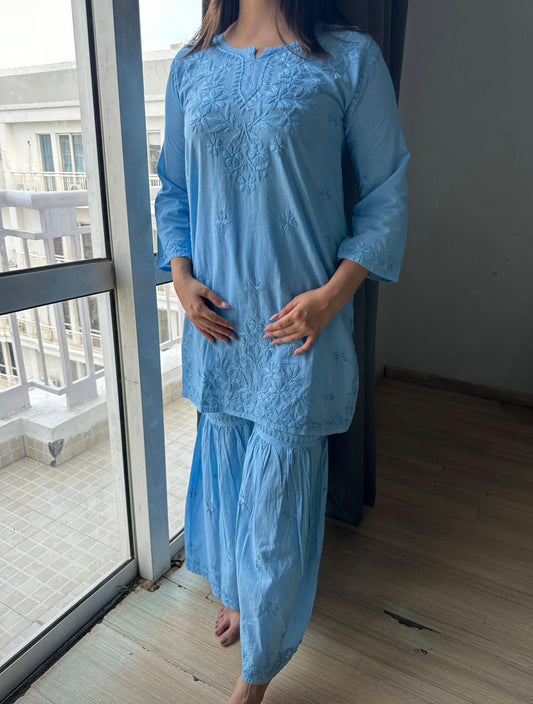Blue Floral Lucknow Chikankari Cotton Kurta Palazzo Set