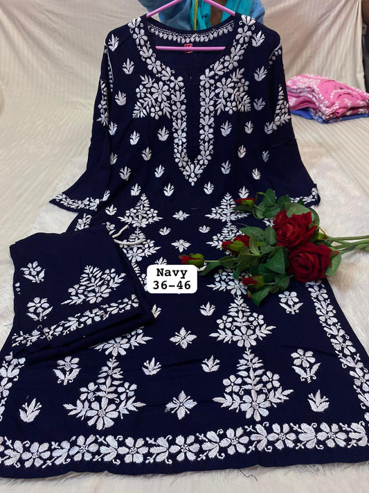 Blue Beautiful 3D Viscose Lucknow Chikankari Work Kurti and Pallazo