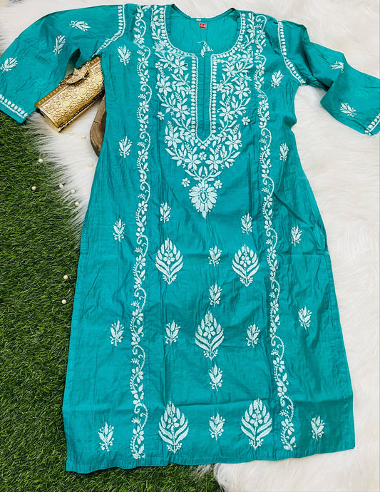 Teal Blue Chanderi Silk Lucknow Chikankari Kurti Set