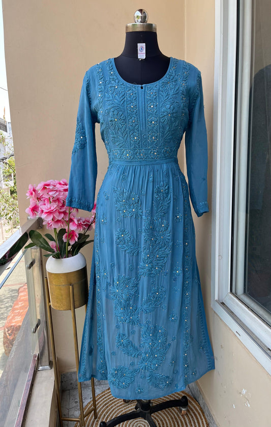 Teal Blue Premium Viscose Lucknow Chikankari Mukaish Hand Work Nyra Cut Kurti