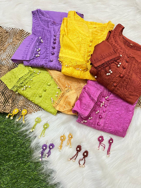 Purple Elegant Chanderi Kurti with Quraishiya & Moti Work – Matching Handmade Earrings & lycra Pant