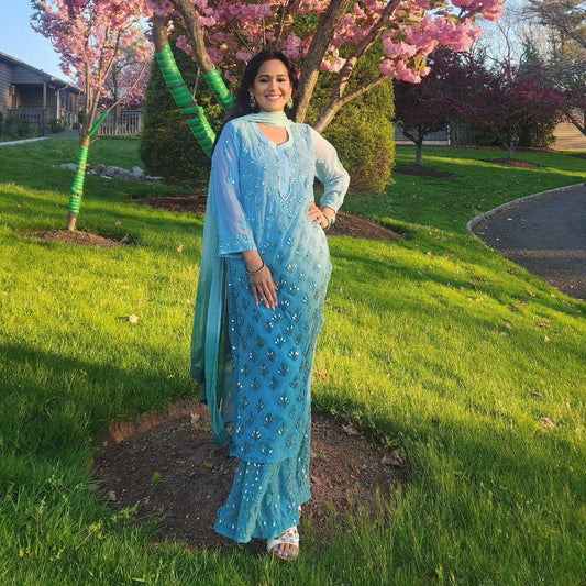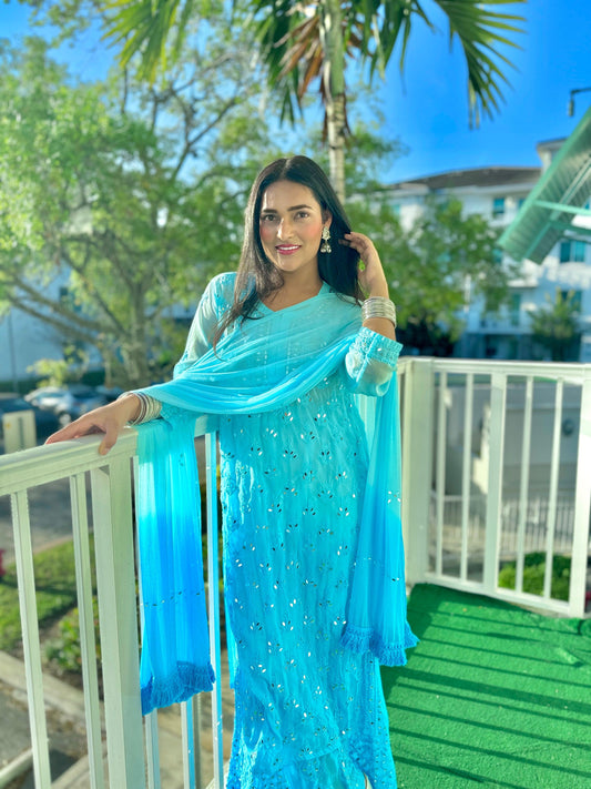 Aqua Blue Chikankari Elegance Ombré Mirror Booti Jaal Set - Kurti, Sharara & Dupatta