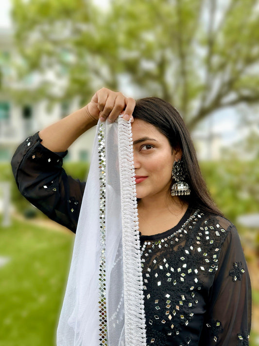 Black Georgette Mirror Gala Booti Chikankari Set with Beautiful Handwork Embroidery