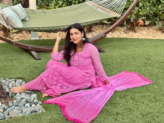 Bright Pink Chikankari Elegance Ombré Mirror Booti Jaal Set - Kurti, Sharara & Dupatta -(Inner Included)