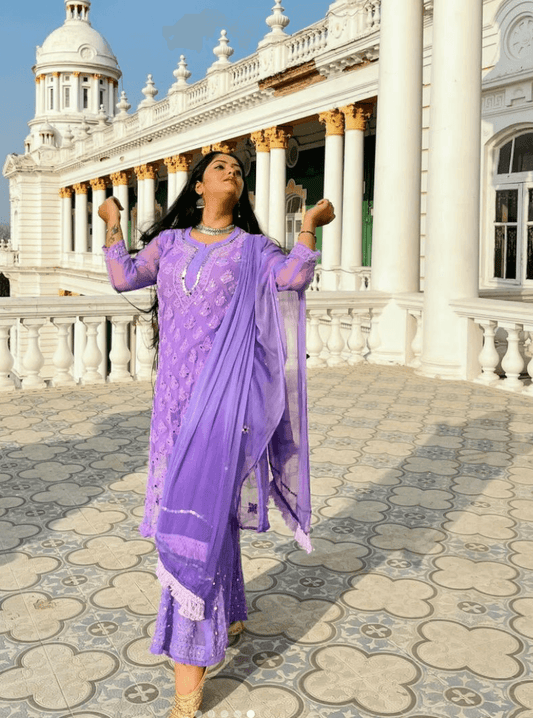 Lilac Chikankari Elegance Ombré Booti Jaal Set - Kurti, Sharara & Dupatta