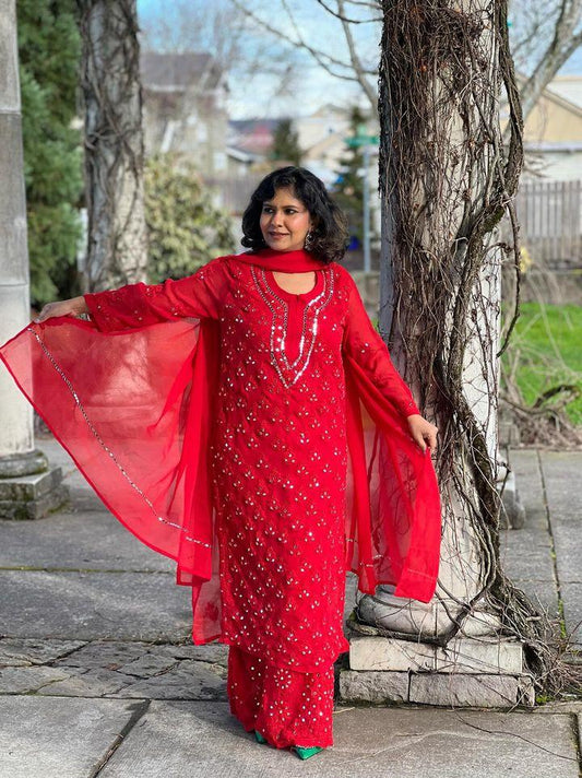 Red Georgette Mirror Gala Booti Chikankari Set with Beautiful Handwork Embroidery