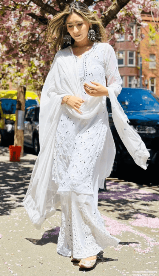 White Georgette Mirror Gala Booti Chikankari Set with Beautiful Handwork Embroidery