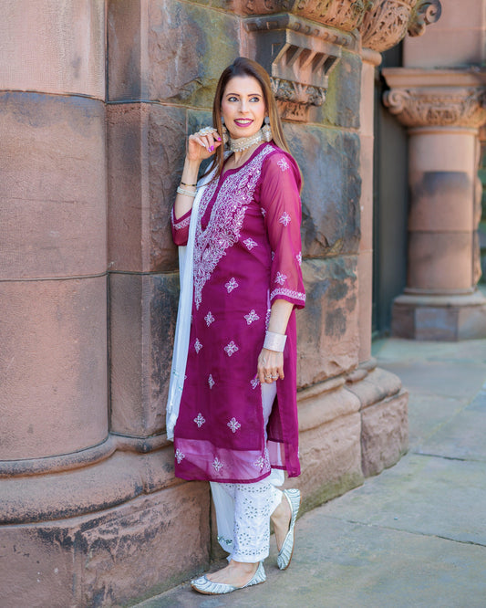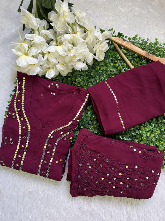 Wine Georgette Mirror Gala Booti Chikankari Set with Beautiful Handwork Embroidery