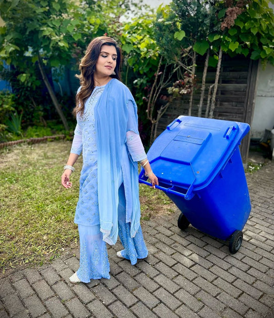 Blue Grey Georgette Mirror Gala Booti Chikankari Set with Beautiful Handwork Embroidery