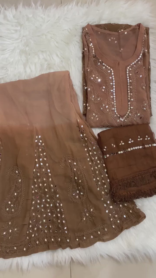 Peach Brown Chikankari Elegance Ombré Mirror Booti Jaal Set - Kurti, Sharara & Dupatta
