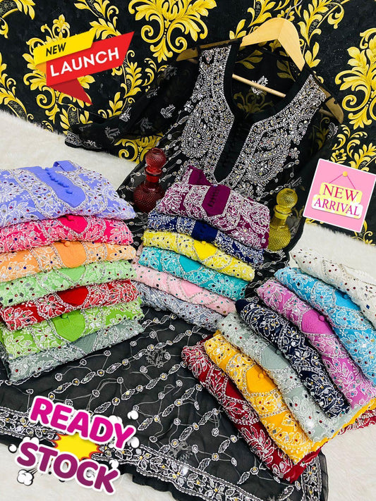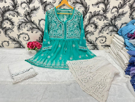 Blue Best Seller Georgette Mirror Gala Booti Chikankari Set with Beautiful Handwork Embroidery