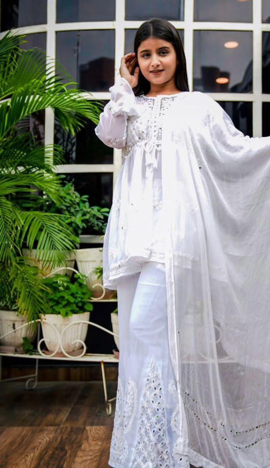 Elegant White Luminous Luxe Lucknawi Chikankari 3 Pc Ensemble