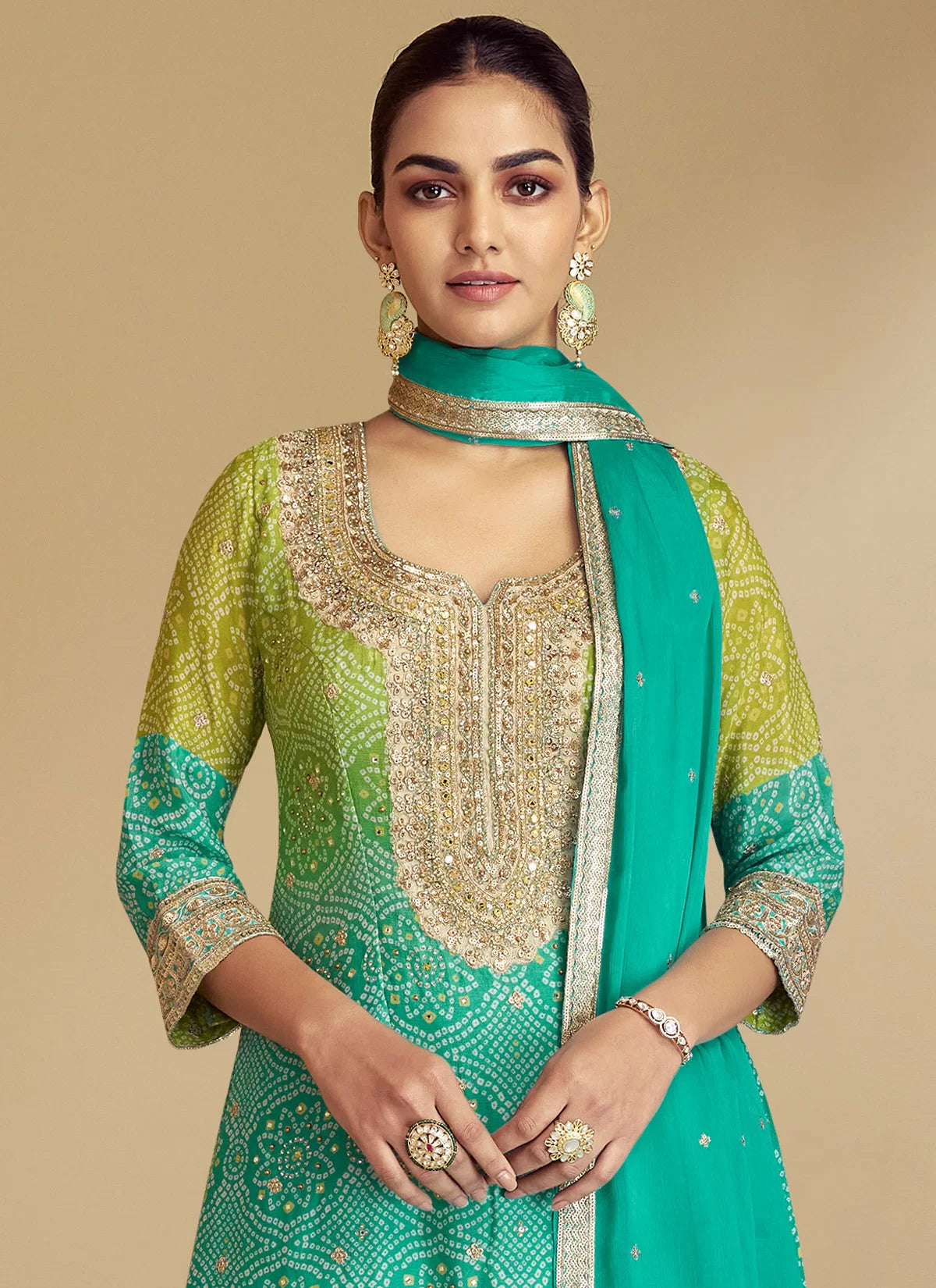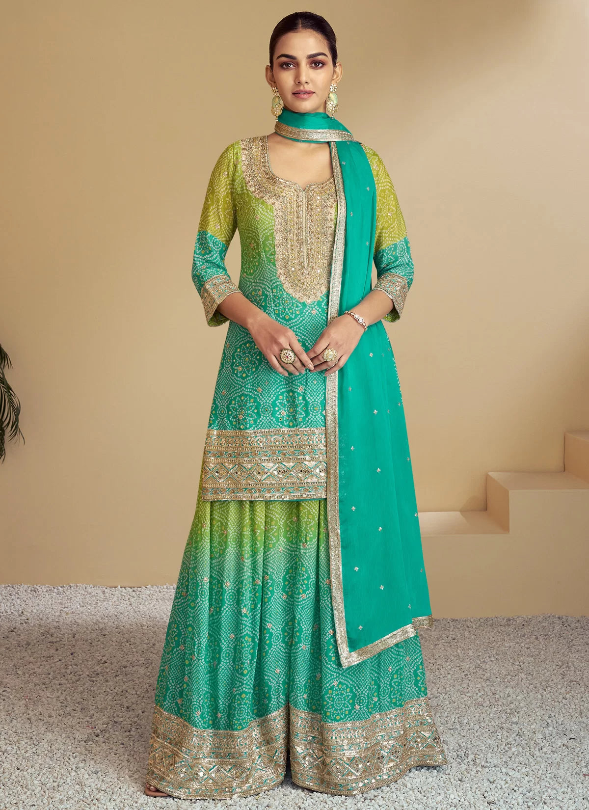 Green Beautiful Lucknow Chikankari Work Ombre Dye Short Kurti, Gharara & Dupatta Sets