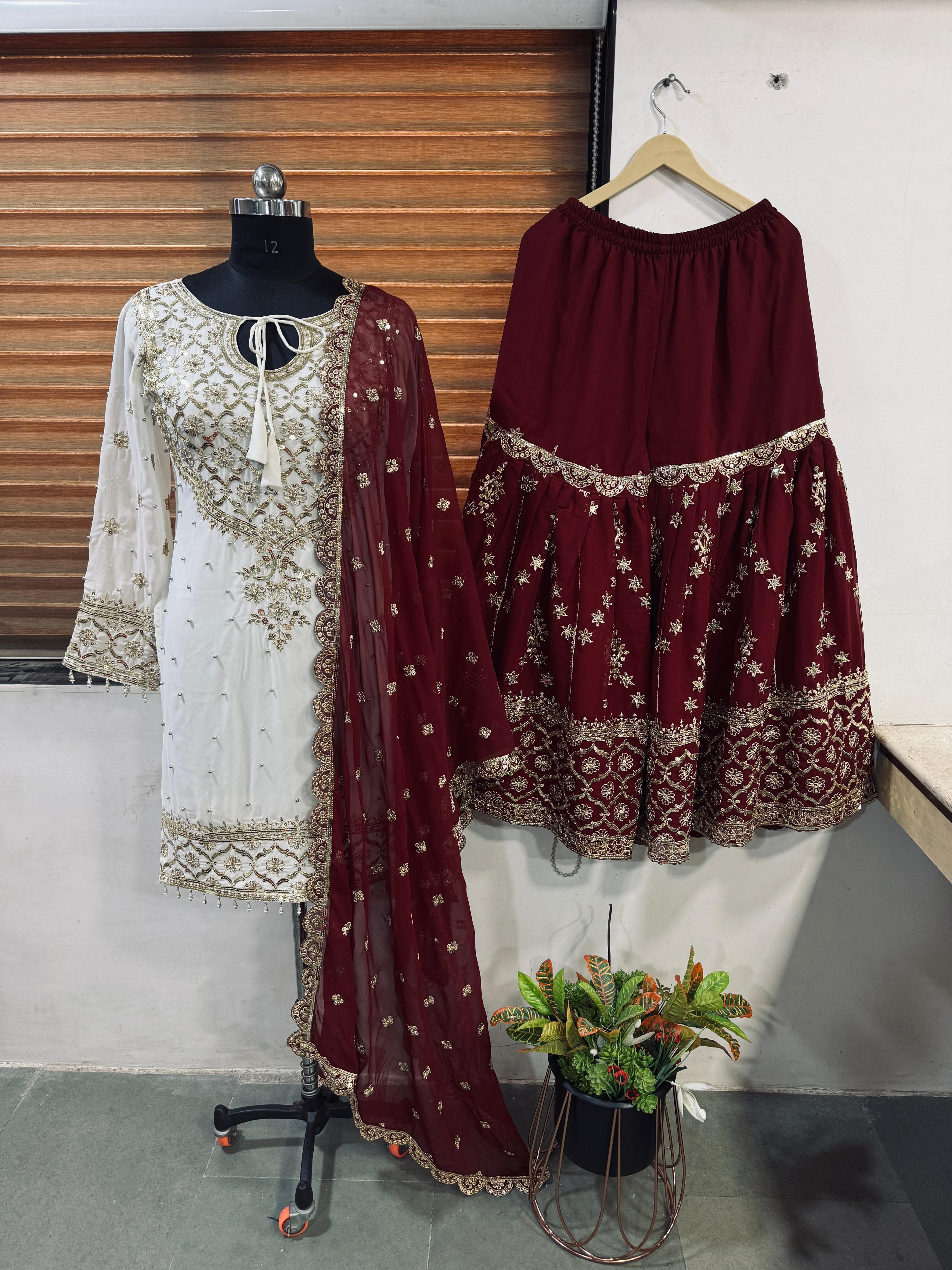 White Premium Modal Silk Chikankari Kurti and Gharara Set Limited Stock