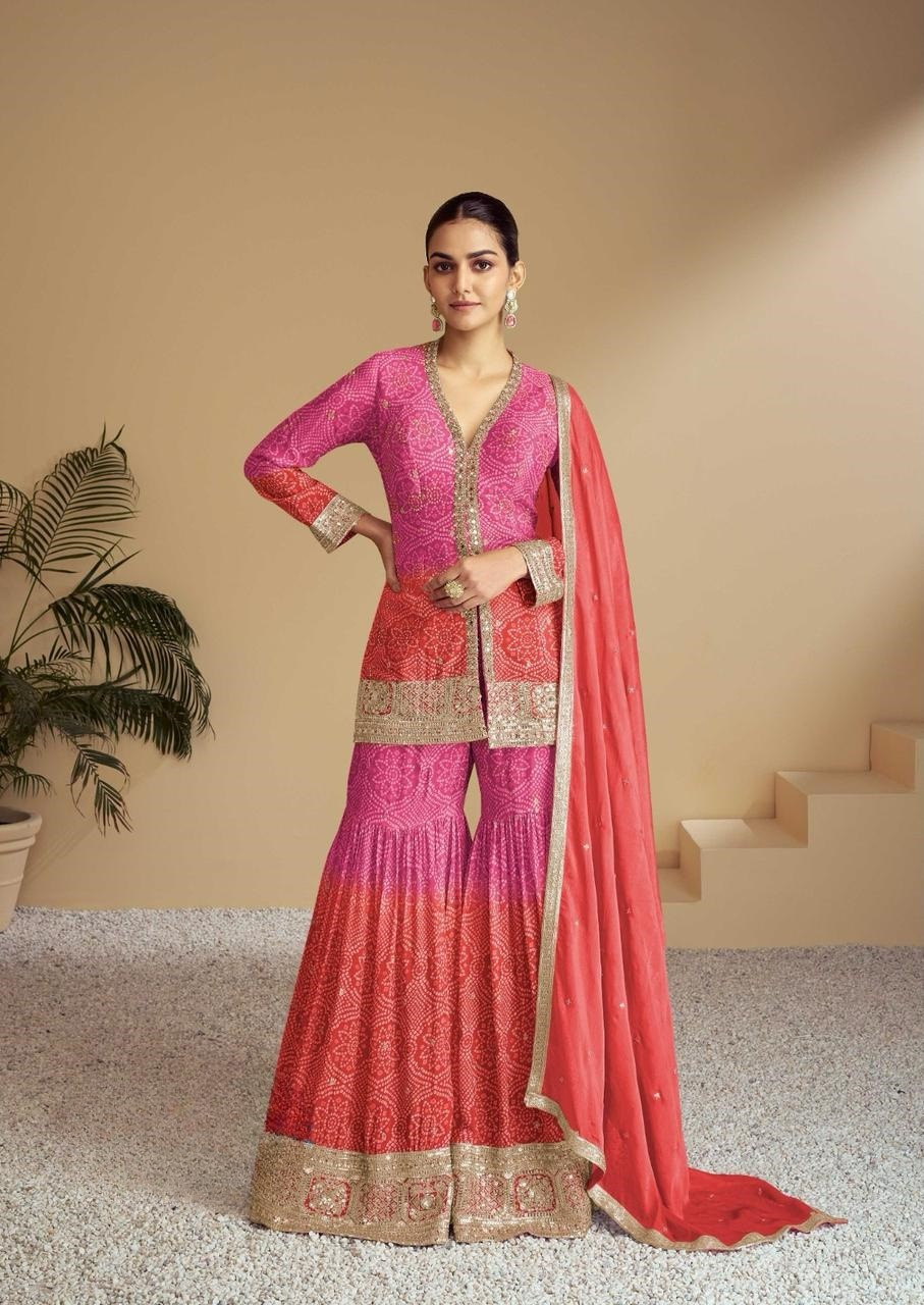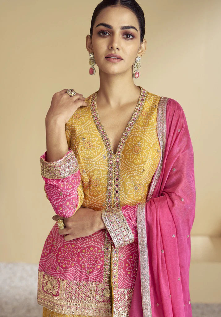 Premium Viscose Lucknow Chikankari Gharara Set in Pink and Yellow