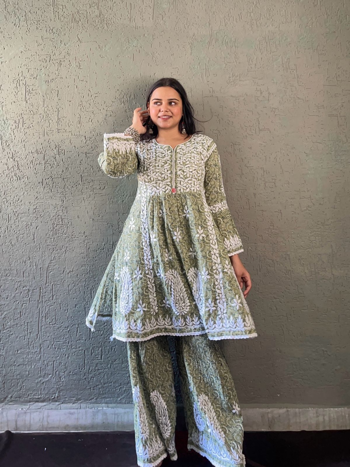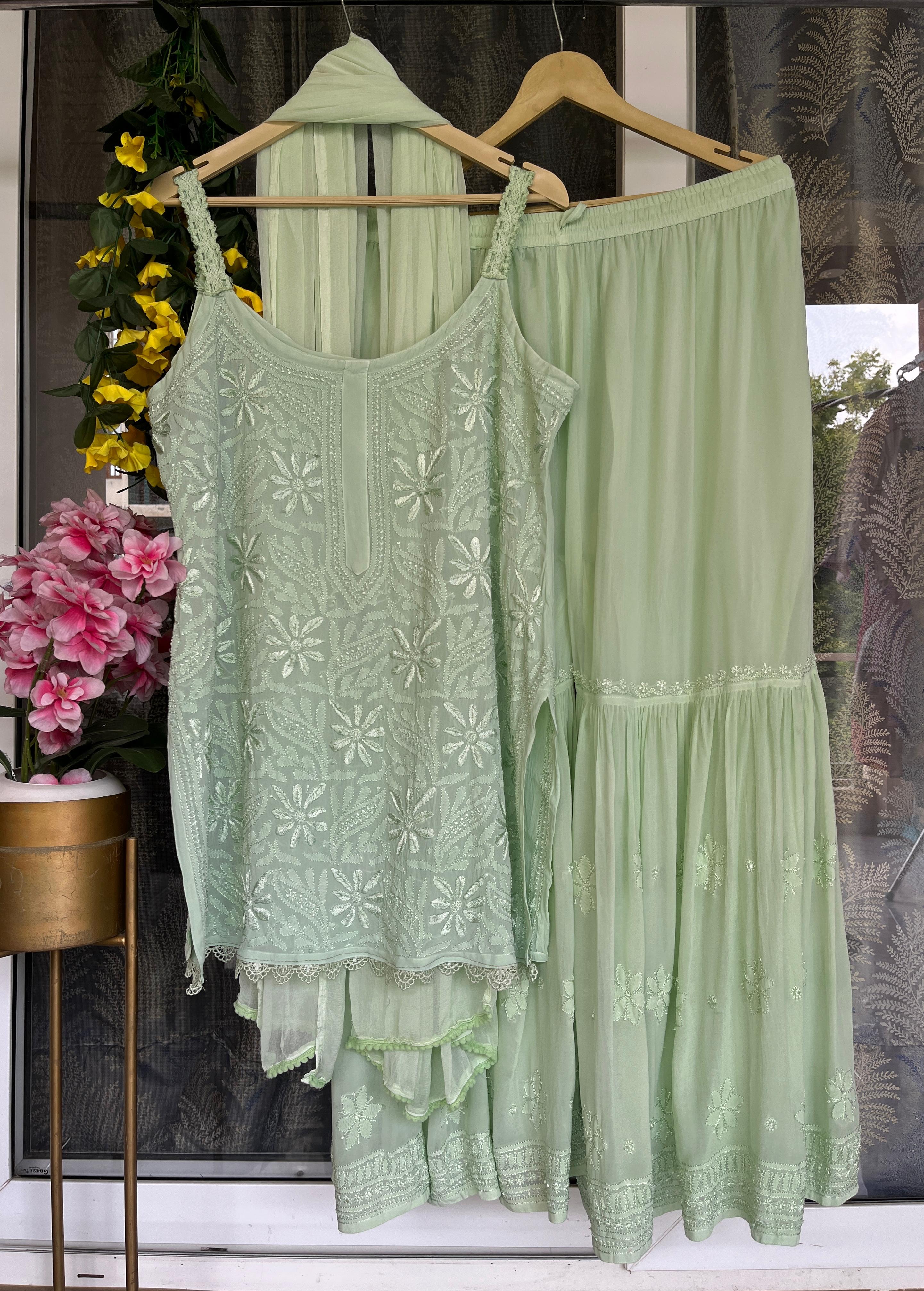Green Premium Modal Silk Chikankari Kurti and Gharara Set Limited Stock