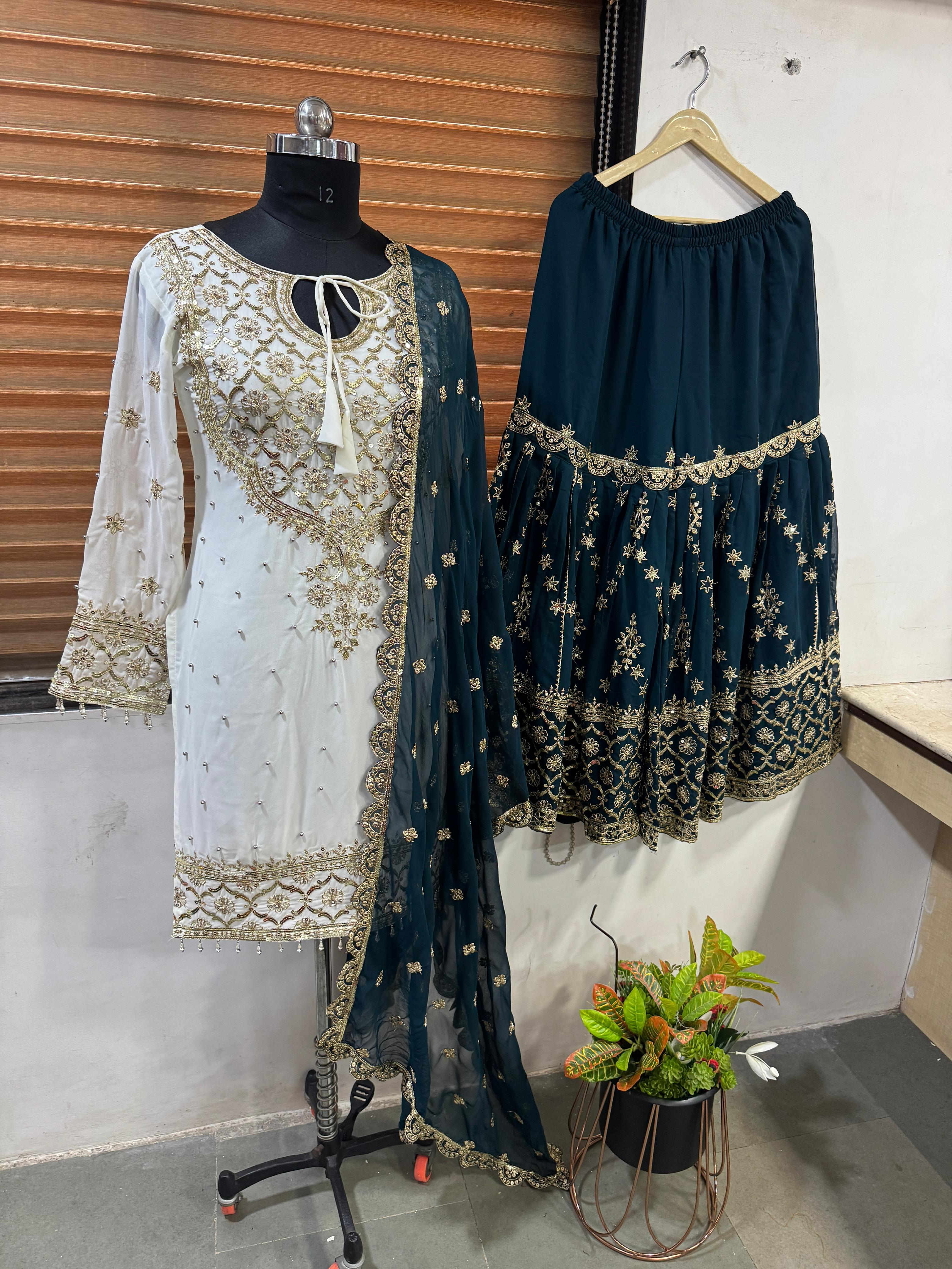 Teal Green Premium Kurti & Gharara Co-ord Set – Lucknow Chikankari Handwork