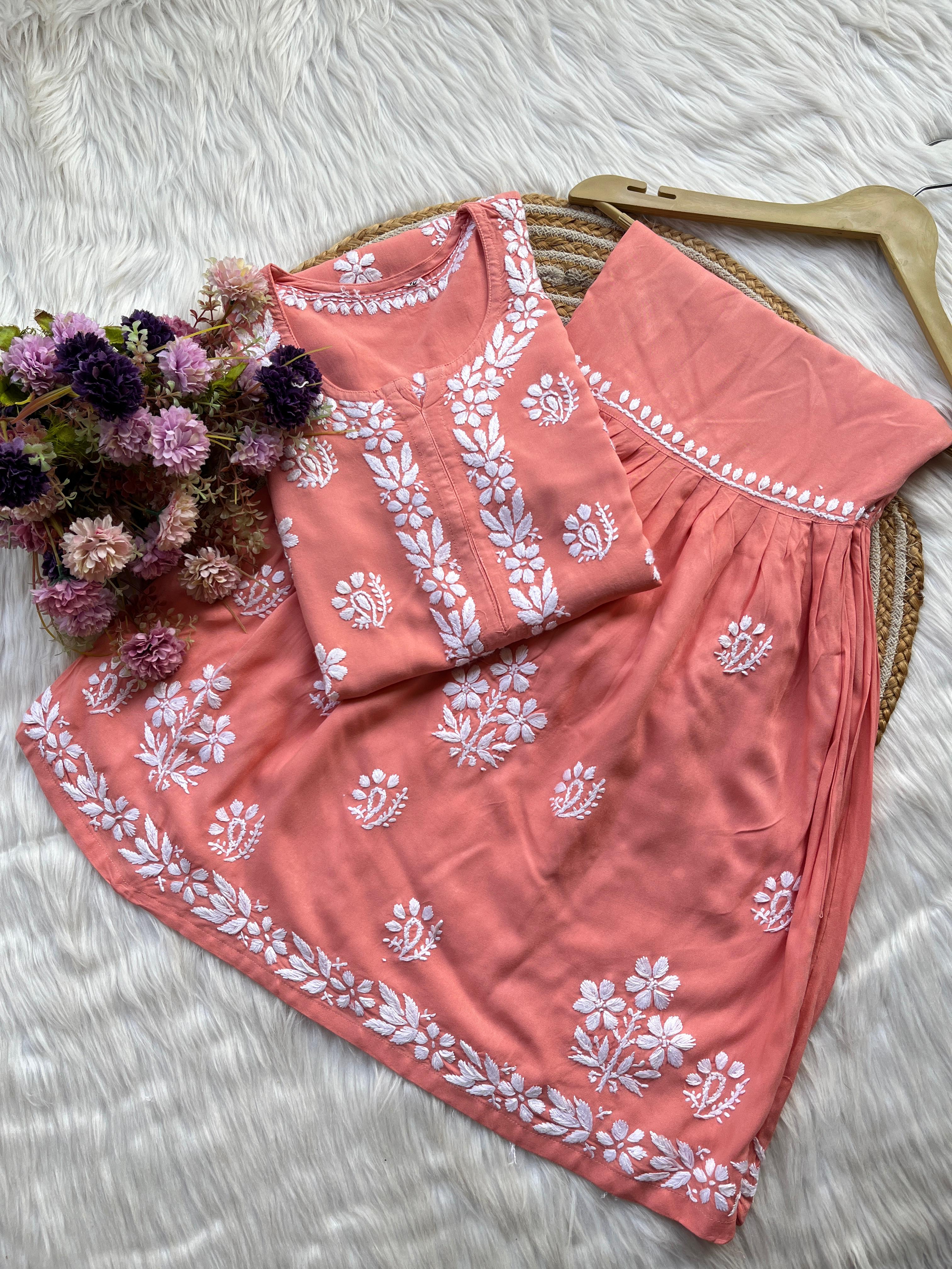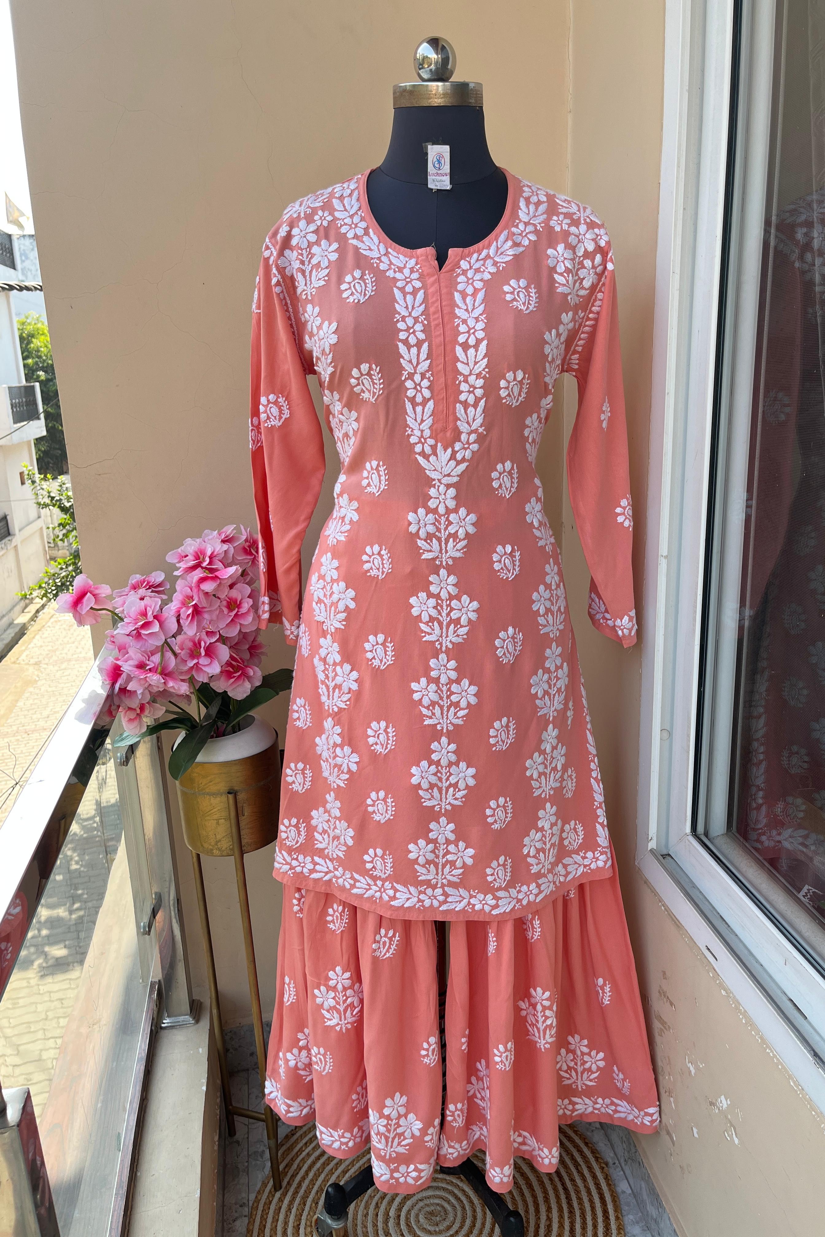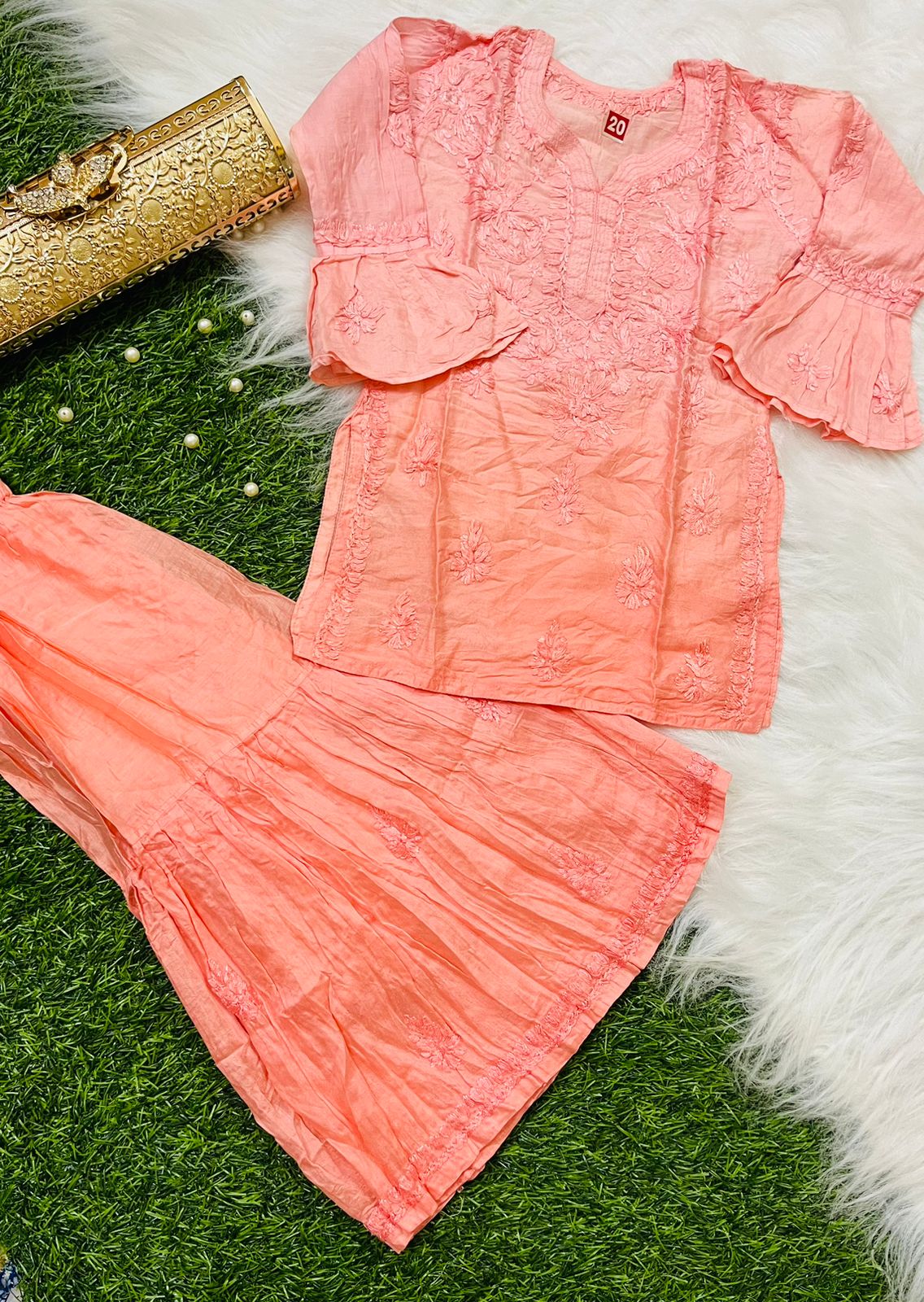 Peach Color Vivid V Lace Chikankari Gharara 3-Piece Set