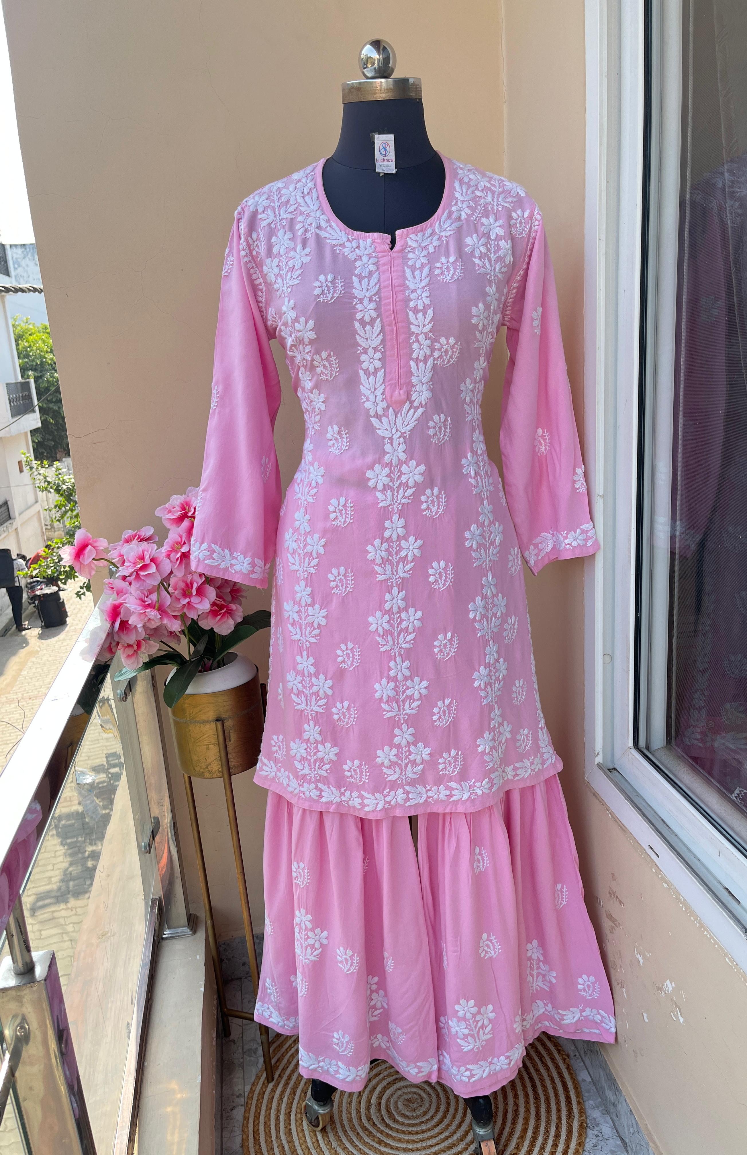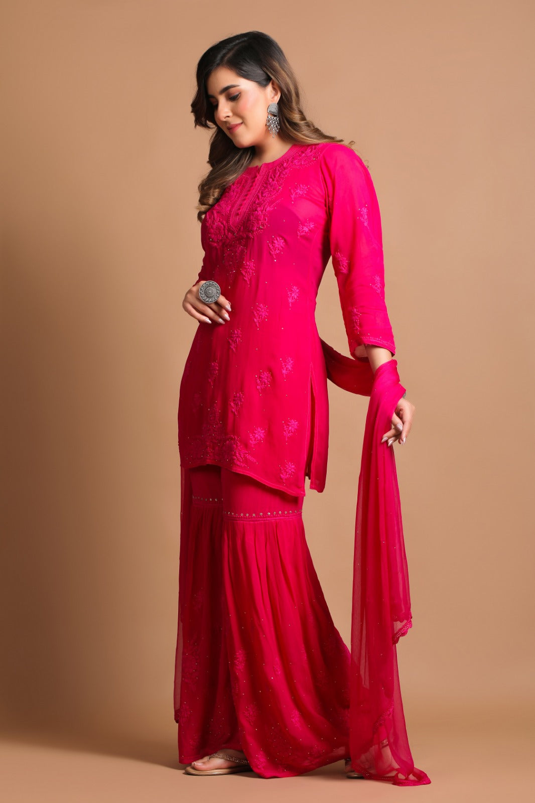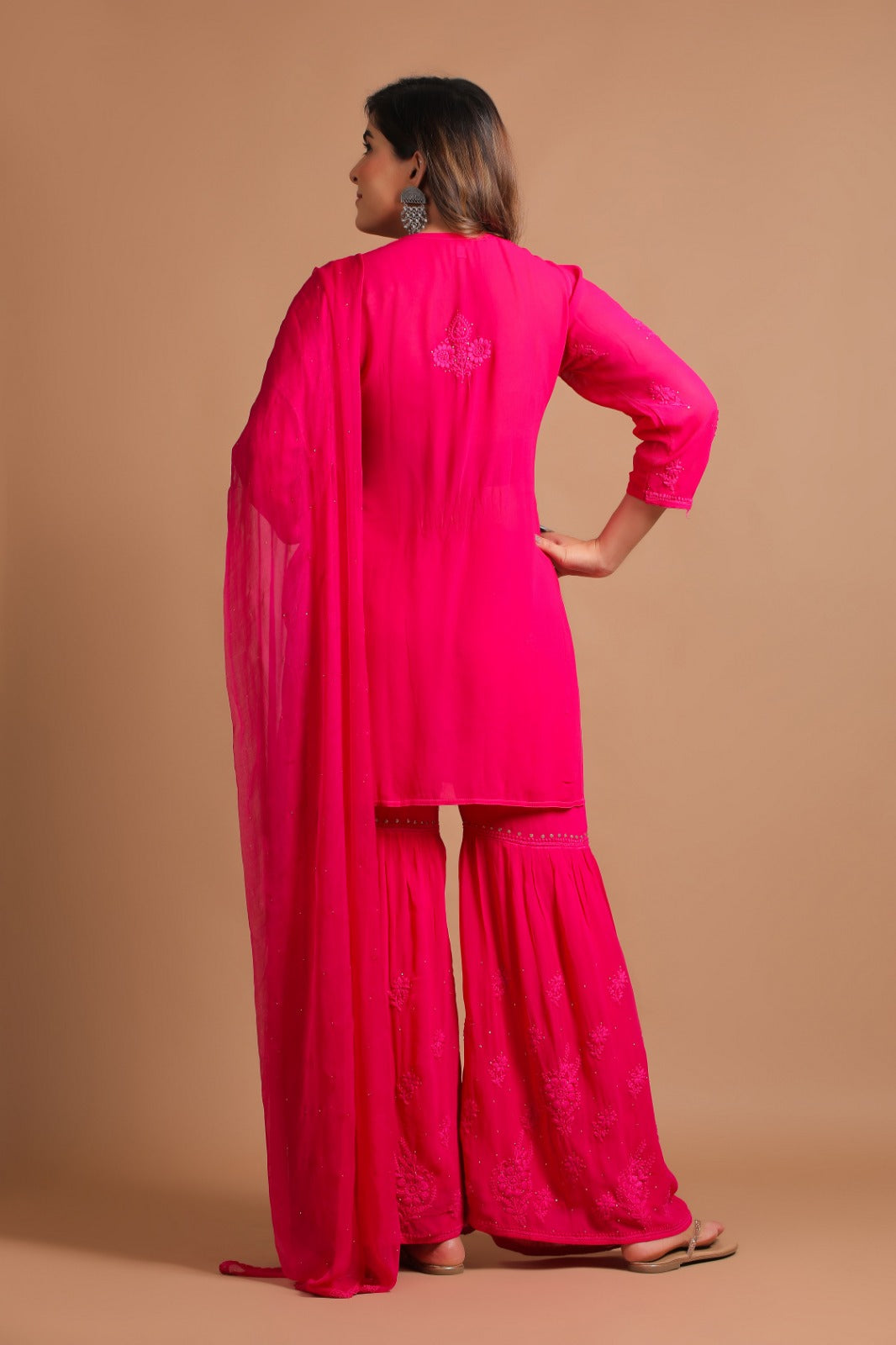 Pink Color Vivid V Lace Chikankari Gharara 3-Piece Set