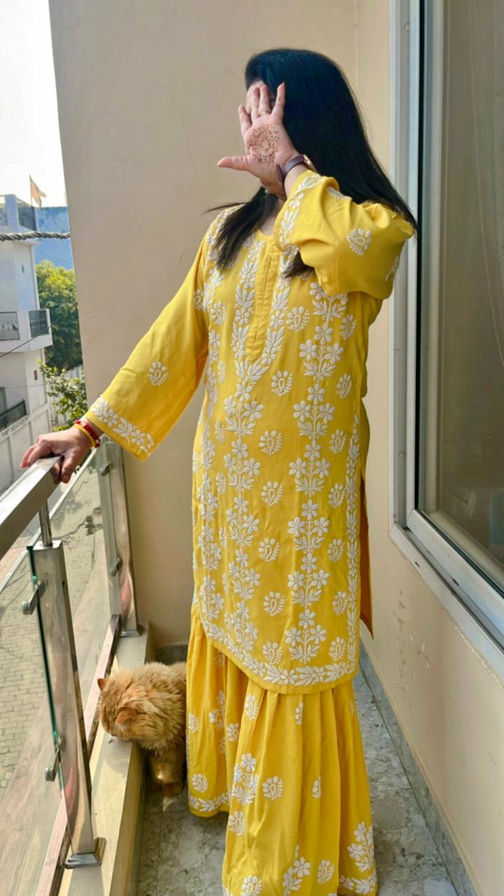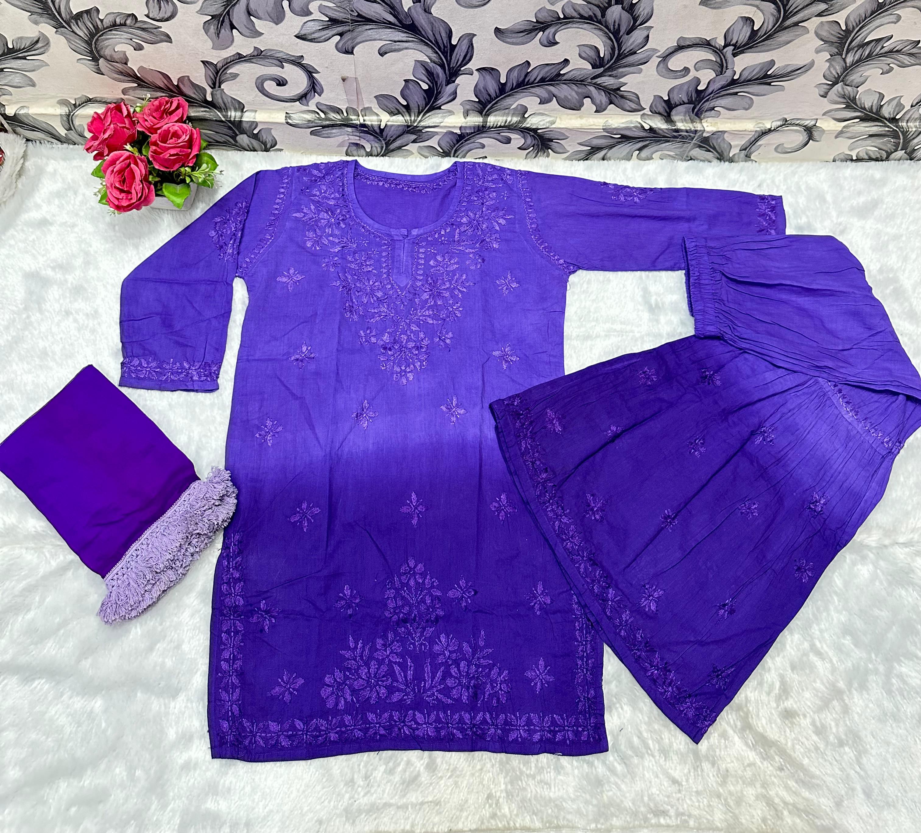 Blue Color Vivid V Lace Chikankari Gharara 3-Piece Set