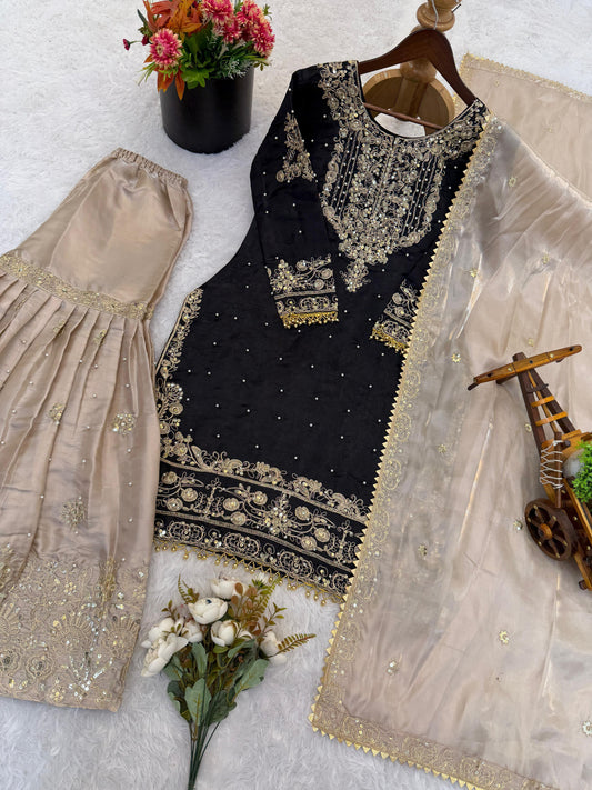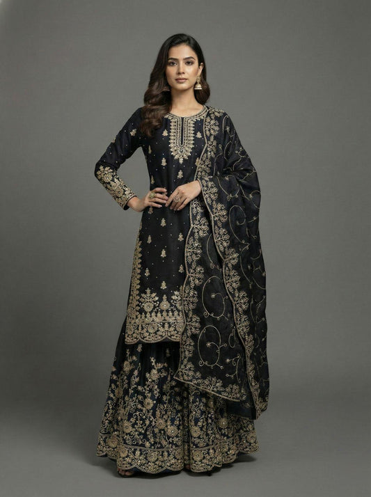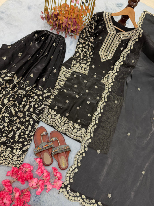 Black Designer Silk Heavy Embroidery Top, Plazzo & Dupatta Set Eid Special