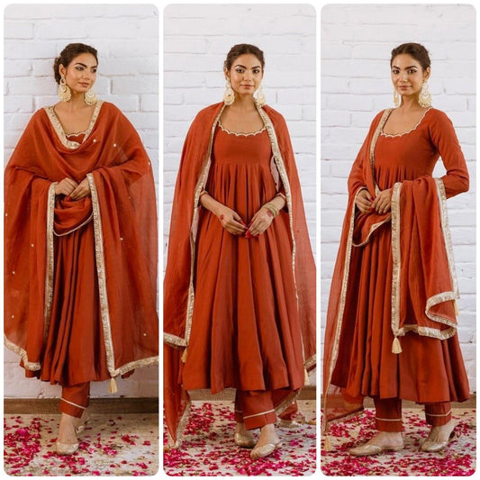 Burnt Orange Designer Faux Georgette Gown with Pant & Dupatta Set