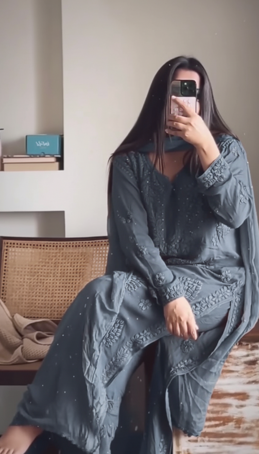 Classic Grey Viscose Chikankari Kurti Set with 3D Handwork Inner included