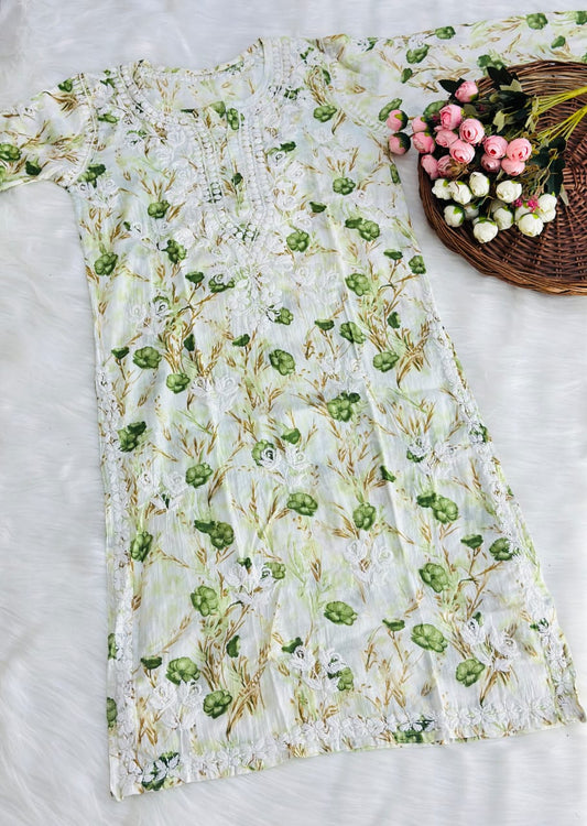 White and Green Floral Premium Quality Mulmul Lucknow Chikankari Palazzo Set