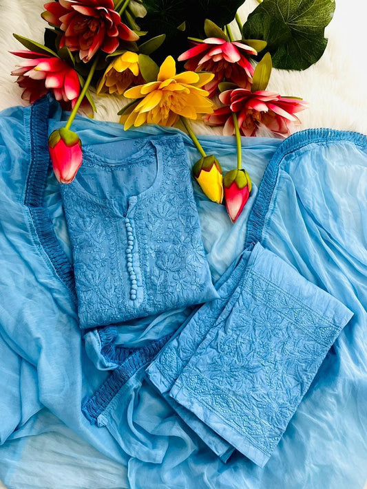 Blue Ombre Lucknow Chikankari Kurti, Palazzo, and Dupatta 3-Piece Set