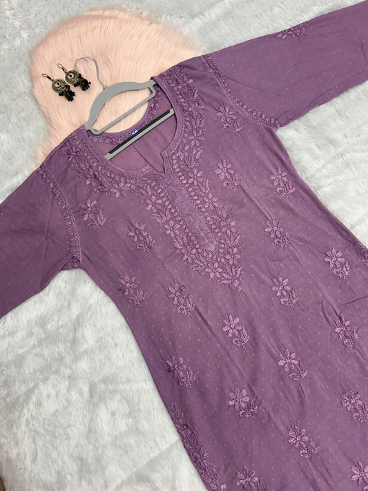 Purple Premium Lucknowi Chikankari Tone-on-Tone Kurti and Pant Set