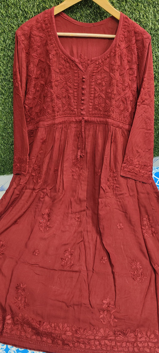 Maroon Fancy Chikankari Cotton Ombre Gown kurti and Pant Set
