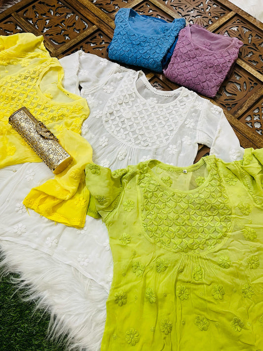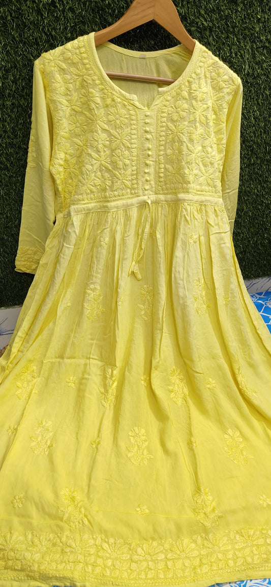 Yellow Fancy Chikankari Cotton Ombre Gown kurti and Pant Set