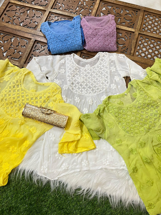 White Elegant Short Lucknow Chikankari Kurti Top with 3D Hand Embroidery