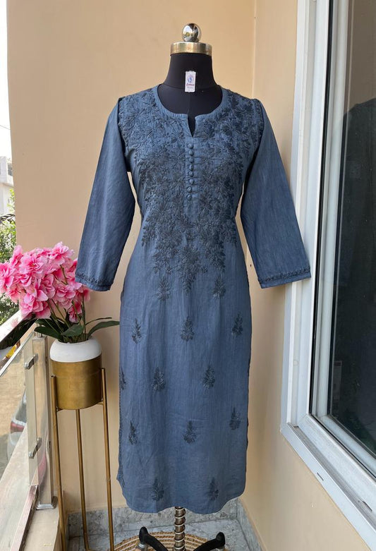 Blueish Grey Vogue Chikankari Long Kurti and Pant Ensemble