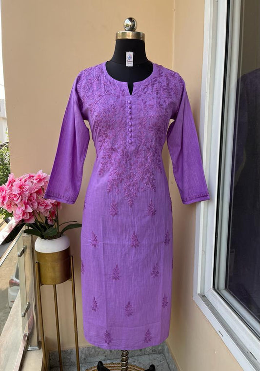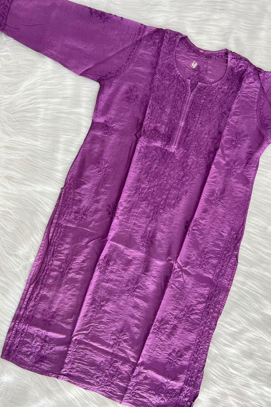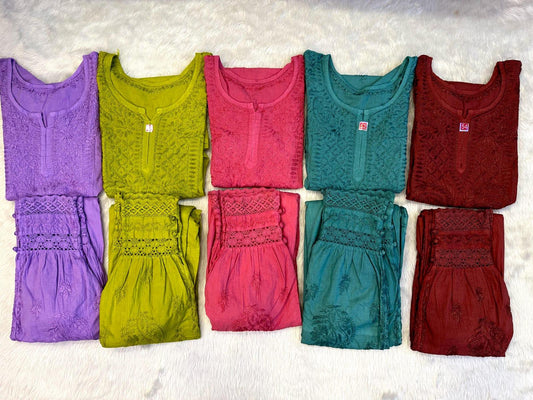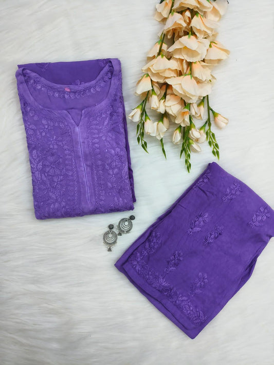 Magenta Purple Cotton Chikankari Hand Work Kurti Pant Sets