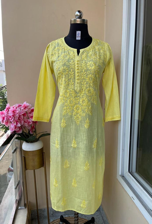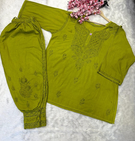 Mustard Cotton Chikankari Hand Work Kurti Pant Sets