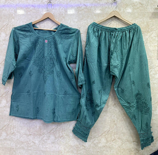 Teal Green Elegant Cambric Cotton Chikankari Afghani Co-ord Ensemble