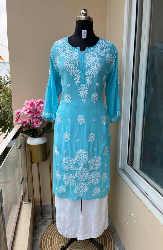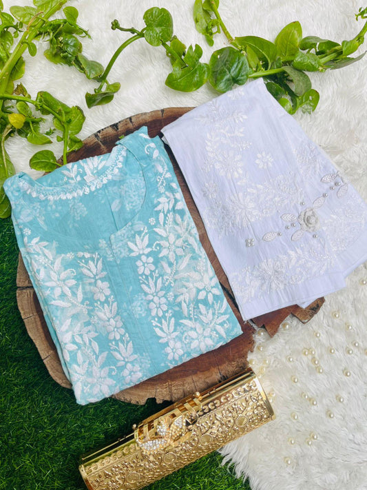 Teal Blue Lucknowi Luxe: Modal Kurti with Heavy Ghas Patti Work & White Chikankari Pants
