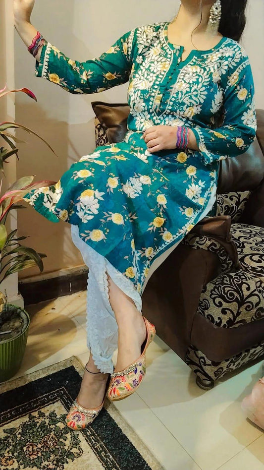 Teal Lucknowi Chikankari Beautiful Premium Chanderi Resham Work Kurti