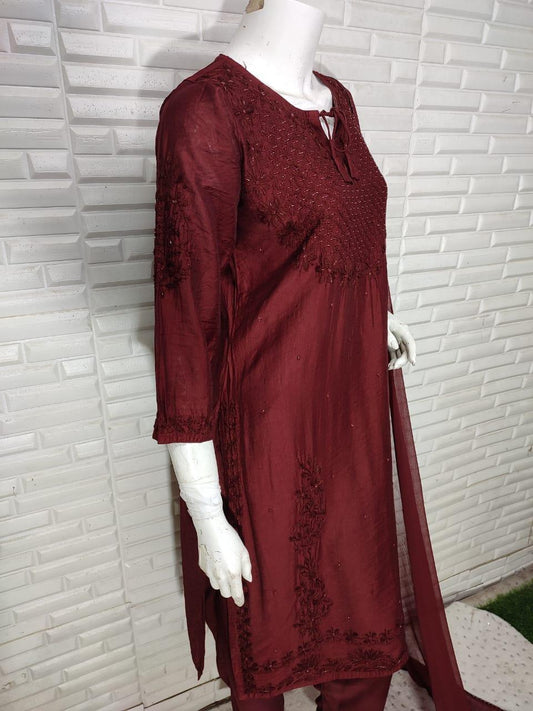 Maroon Lucknowi Chikankari Rayon Kurti and Palazzo Set with Chiffon Dupatta